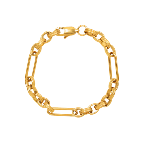 The Anderson Bracelet leans into bold structure with its oversized chain-link design and balanced proportions. With a 6.5-inch length and 5mm width, it fits close to the wrist without feeling heavy. The links alternate between rounded and elongated forms, giving it texture and movement without going overboard. It’s waterproof and made for repeat wear, no polishing, no fading, no need to take it off.