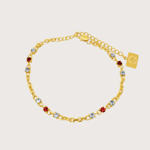 The Sahara Bracelet mixes simplicity with a touch of contrast through alternating red and white stones, giving it a slightly vintage feel without veering into delicate. Each gem is spaced evenly along a fine 3mm gold-plated stainless steel chain that adjusts between 6 and 8 inches, making it easy to get the fit just right. The color pairing isn’t flashy but still catches light in a subtle way, offering a hint of brightness on the wrist.