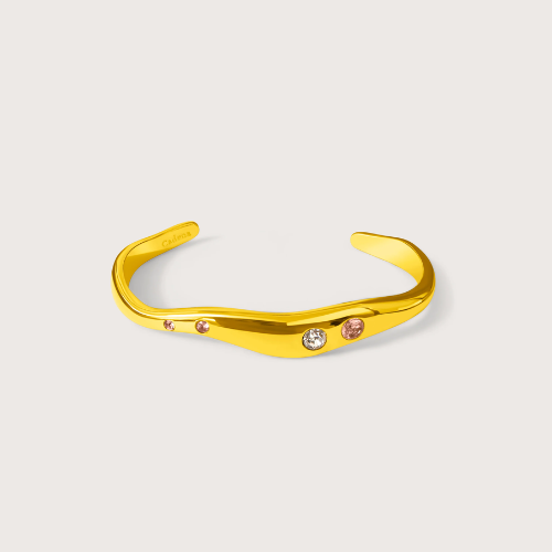 The Adjustable Faro Bangle in Gold takes a softer approach to structure with its curved wave design and quiet asymmetry. Polished to a mirror finish and set with pink and white cubic zirconia stones, it carries a bit of light without feeling overly polished or delicate. The bangle adjusts to fit comfortably and is made with the same waterproof, skin-safe materials used across the Raena Stones jewelry line.